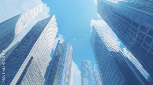 A street-level view of high-rise office buildings, their modern lines cutting through a bright blue sky