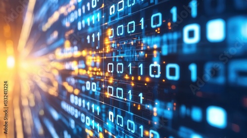 A striking abstract visualization of data transfer and digital communication in a vibrant glowing tunnel of binary code and electronic patterns symbolizing the fast paced