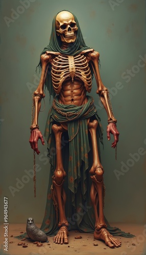 A striking artistic representation of a skeletal figure draped in fabric, embodying themes of mortality and the human condition, perfect for creative and educational projects.