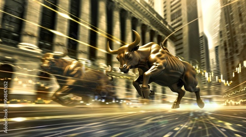 bull, urban, city landscape, dusk, motion, energy, street, light, financial district, dynamic, charging, architecture, skyline, bronze, sculpture, business, fast, motion blur, horn, vibrant, night, excitement, modern, commerce, strong, power, influence, capital, investment, market, stock exchange, wall street, growth, prosperity, challenge, thrive, animal, movement, high-coloured, speed, downtown, metallic, outdoors, bustling, evening, finance, business district