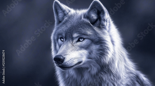 A striking close-up of a silver wolf, its face partially lit by soft ambient light, revealing intricate fur details and piercing eyes