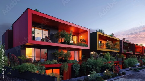 architecture, building, exterior, contemporary, design, modern, residential, home, house, apartment, condominium, glasses, facades, balcony, garden, landscape, lighting, sunset, sky, environment, nature, vegetation, greenery, colours, red, orange, urban, city, real estate, construction, development, technology, energy, efficiency, aesthetic, minimalist, luxury, lifestyle, living, cosy, warm, inviting, comfortable, peaceful, serene, environmentally friendly, sustainable, smart, geometric