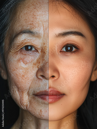 A striking face split, showcasing aging and youth, hinting at the role of cosmetic surgery in preserving youthful appearances.