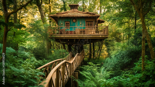A striking image of an eco-friendly treehouse, showcasing an innovative design that harmoniously coexists with its natural environment