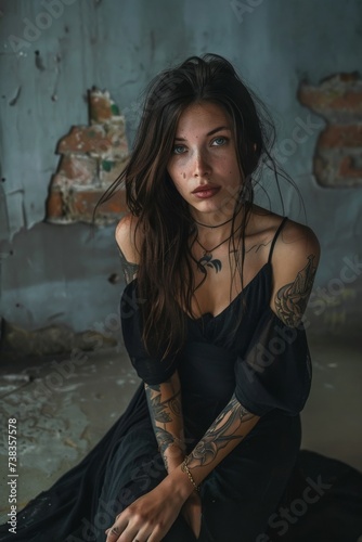human face, person, clothing, lady, long hair, model, wall, fashion model, woman, girl, indoor, fashion, tattoo, portrait, dress, black dress, elegant, mysterious, alluring, sophisticated, confident, captivating, graceful, enchanting, stylish, trendy, edgy, haute couture, stunning, radiant, dramatic, expressive, striking, fierce, glamourous, empowered, sensual, bold, modern, artistic, vibrant, contrasting, unique, rebellious, provocative, symbol