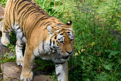 tiger, wildlife, habitat, nature, animal, big cat, stripes, prowling, greenery, lush, powerful, day, ecosystem, behaviour, predator, felino, jungle, fur, paw, environment, wilderness, adventure, biodiversity, solitary, majestic, regal, carnivore, mammal, endangered species, earth, animal kingdom, prey, observation, wild animal, fauna, mammal