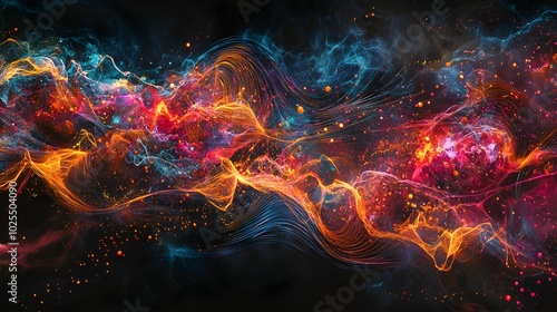 striking, visualisation, quantum, webbed, vibrant, particle, dancing, across, dark, background, interconnected, glowing, line, that, illustrate, their, entangled, state, interaction