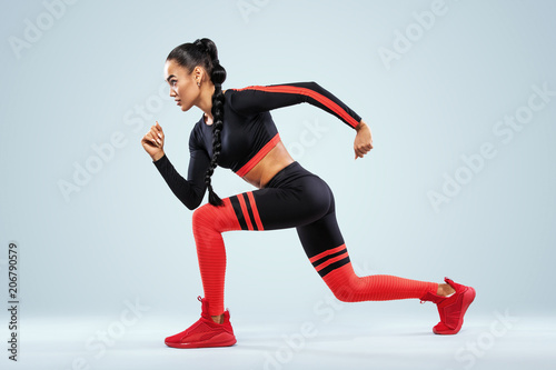 A strong athletic, women sprinter, running wearing in the sportswear, fitness and sport motivation. Runner concept with copy space. Dynamic movement