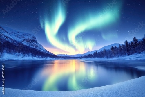 A stunning aurora borealis display illuminates the night sky over a frozen lake in a snowy landscape.