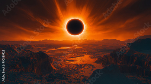 A stunning cinematic photograph featuring a rare and mesmerizing solar eclipse. The sun is eclipsed by a dark, glowing corona that emits a striking black light