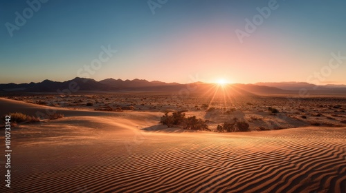 A stunning desert landscape at sunrise, featuring rippled sand dunes and distant mountains under a clear blue sky.