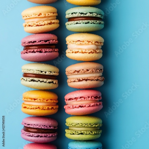 A stunning display of colorful macaroon cookies presents a feast for the eyes, with every hue enticingly stacked against a bright background. Each treat promises a burst of flavor and joy