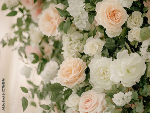A stunning floral wedding arch with peach and white roses, perfect for a romantic and elegant ceremony backdrop.