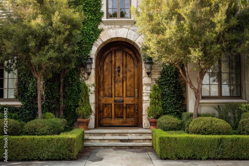door, luxury, house, brown, wood, arched, window, hedge, front, yard, exterior, architecture, residential, entranceway, facades, design, upscale, property, landscaping, home, sunlight, modern, tree, nature, garden, scene, contemporary, symmetry, detail, elegance, inviting, warm, structure, frame, suppressing, aesthetic, impression, tranquil, pathway, welcome, environment, green, peaceful, surrounding, style, open, security, concept, visually