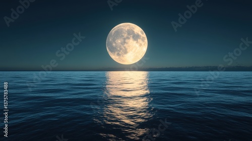 A stunning full moon reflects beautifully on calm ocean waters under a dark, serene sky.