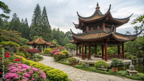 A stunning garden featuring an intricately designed pagoda with curved roofs and ornate details, set against a backdrop of vibrant flora and towering trees, scenic, trees, design