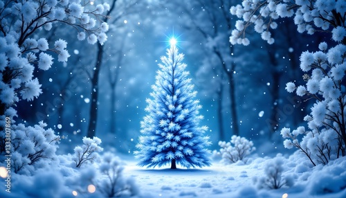 A stunning holiday card design featuring a mesmerizing blend of blue floral elements, snow glitter, and a majestic tree