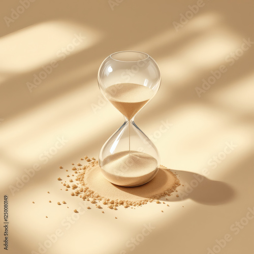 A stunning hourglass with flowing sand, casting dynamic shadows on a neutral beige surface. Perfect for themes of time, elegance, and minimalism.