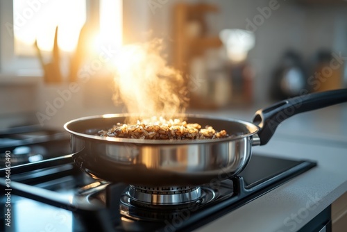 A stunning image of rice steaming in a polished pan captures the beauty of culinary art, emphasizing the connection between food preparation and home cooking in a modern kitchen.