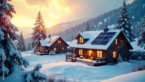 solar panel, clean energy, photorealistic, winter scene, winter, snow, mountain, house, landscape, cold, forest, tree, nature, cabin, christmas, sky, ski, tree, snowy, season, white, village, ice, alps, blue, holiday, wood, bungalow, mountain