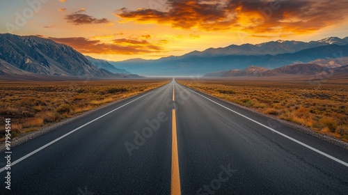 A stunning journey awaits on this lonely road, embraced by breathtaking mountains and a vibrant sunset painting the sky in colors.