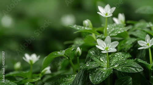 A stunning macro photograph of a small plant featuring white flowers surrounded by lush green leaves, each droplet of water amplifying the vibrant scene's freshness.