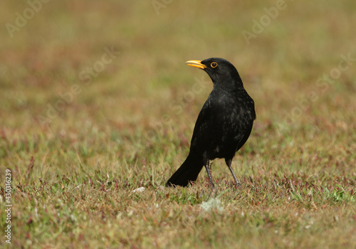 A stunning male Blackbird, Turdus merula, hunting for earthworms in the grass.