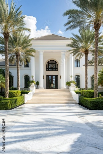 A stunning modern mansion featuring elegant architecture, palm trees, and a grand entrance, set against a bright blue sky.