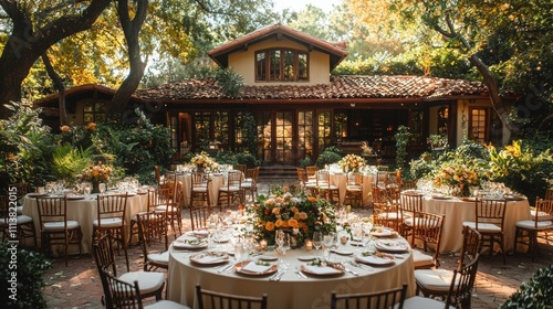 A stunning outdoor wedding reception set in a lush garden, featuring elegant tables adorned with floral arrangements and a charming house in the background.