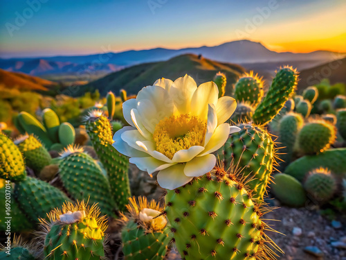 A stunning saguaro cactus flower in full bloom at sunrise in the arizona desert landscape