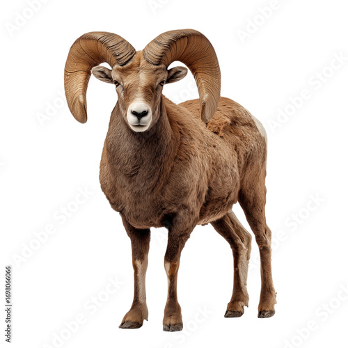 A stunning studio shot of a bighorn sheep, showcasing its impressive, curved horns and commanding presence.
