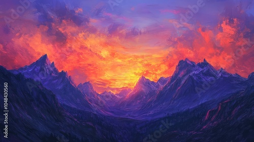 A stunning sunrise sky over rugged mountains with vibrant orange and pink hues casting a soft glow on the peaks below
