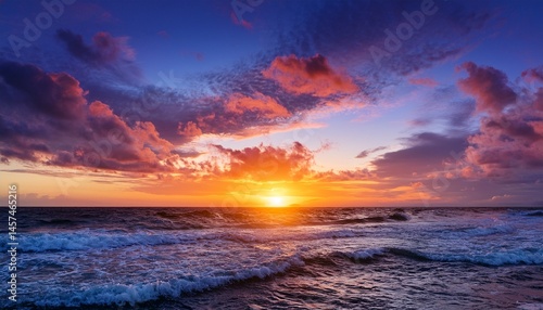a stunning sunset over a turbulent ocean with dramatic clouds illuminated in vibrant shades of orange pink and blue the scene captures the vivid transition of daylight to dusk with the sun partia