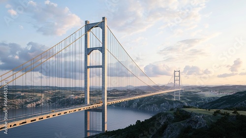 bridge, architecture, river, landscape, design, connectivity, exploration, reflections, vista, connecting, peaceful, skyline, dramatic, path, suspension, structure, elevation, infrastructure, engineering, transportation, modern, steel, horizon, crossing, outdoors, cable, blue, sky, journey, sunlight, scenery, scenic, beauty, urban, green, construction, nature, environment, travel, mountain, landmark, city landscape, adventure, tour tourism, view
