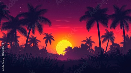 tropical, panorama, stunning, vibrant, sunset, fiery, orange, pink, hue, silhouette, swaying, palm, tree, picturesque, serene, natural, outdoors, radiant, bright, harmonious, scenic, elegant, graceful, breathtaking, idylli, peaceful, exotic, refreshing, dynamic