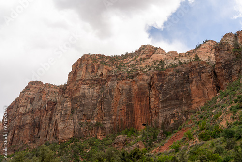 A stunning view of red rocks on a cloudy day at Zion National Park, Utah.