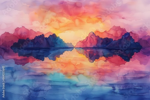 A stunning watercolor painting featuring a vibrant sunset over calm waters, framed by majestic mountains, showcasing vivid and harmonious colors.