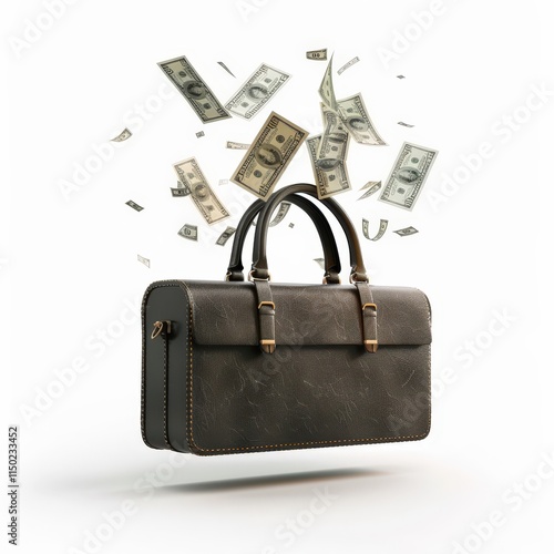 A stylish bag with flying dollar bills symbolizes wealth and prosperity, highlighting the connection between fashion and money.