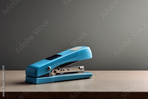 A stylish blue stapler sits on a wooden desk against a gray backdrop, a minimalist office essential.