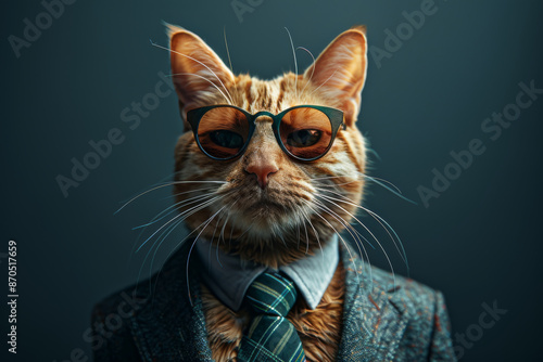 cat, ginger, suit, goggles, serious, expression, thoughtful, sharp, sophisticated, animal, pet, felino, fur, whisker, eye, orange, brown, black, attaching, collar, formal, elegant, fashion, style, cool, trendy, portrait, closeup, studio, photo, background, dark, blue, grey, texture, pattern, fabric, light, shadow