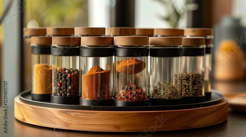 A stylish rotating spice rack with glass jars, each featuring a sleek metal lid. The compact design blends practicality with modern appeal.