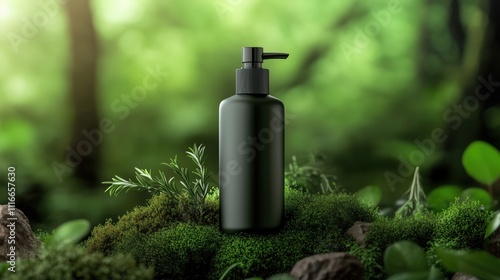 A stylish shampoo bottle surrounded by fresh green moss and small sprigs of rosemary or thyme.