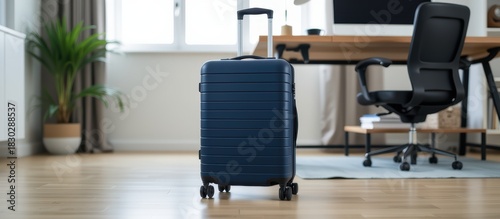A stylish suitcase in a modern workspace with a plant and office furniture.