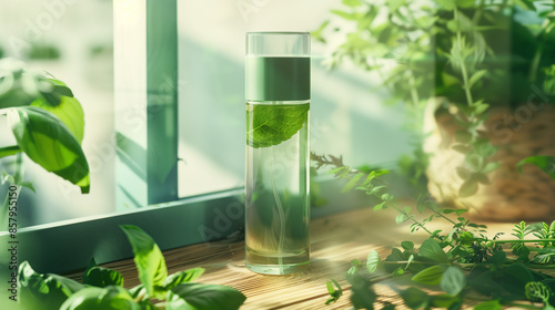 A stylish, transparent perfume bottle with a cylindrical shape, containing a green, herbal fragrance