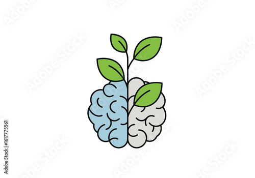 A stylized illustration of a human brain with a plant growing from it, representing growth and knowledge.