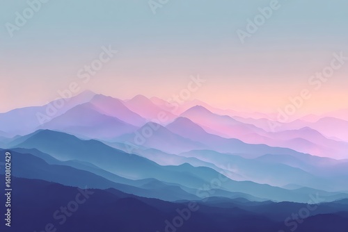 A stylized mountain range in soft pastel hues stretches across the horizon. The peaks blend into the sky with gradient transitions, creating a calming, meditative landscape