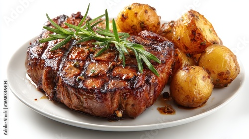 A succulent grilled steak garnished with rosemary, served alongside perfectly roasted golden potatoes, showcasing an appetizing culinary delight for meat lovers.