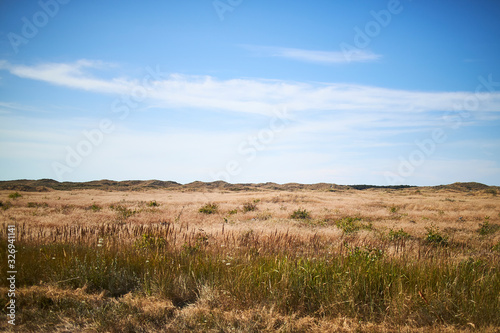 denmark, beach, summer, sand, autumn, nature, blue, grass, coast, horizon, background, sky, water, scandinavia, nobody, europa, sunny, landscape, shore, dune, yellow, danish, space, copy, scandinavian