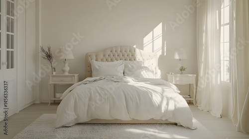 bedchamber, light, beige, headboard, bed, white, linen, soft, sunlight, interior, decor, room, simple, modern, clean, minimalist, design, furniture, natural, comfortable, home, cosy, decorating, style, elegant, neutral, peaceful, quiet, empty, warm, classic, wooden, table, curtain, floor, rug