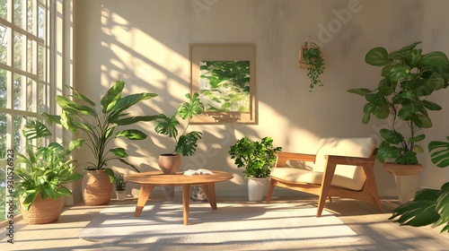 A sunlit living room with a comfortable armchair, coffee table, and potted plants. The warm light creates a cozy and inviting atmosphere.